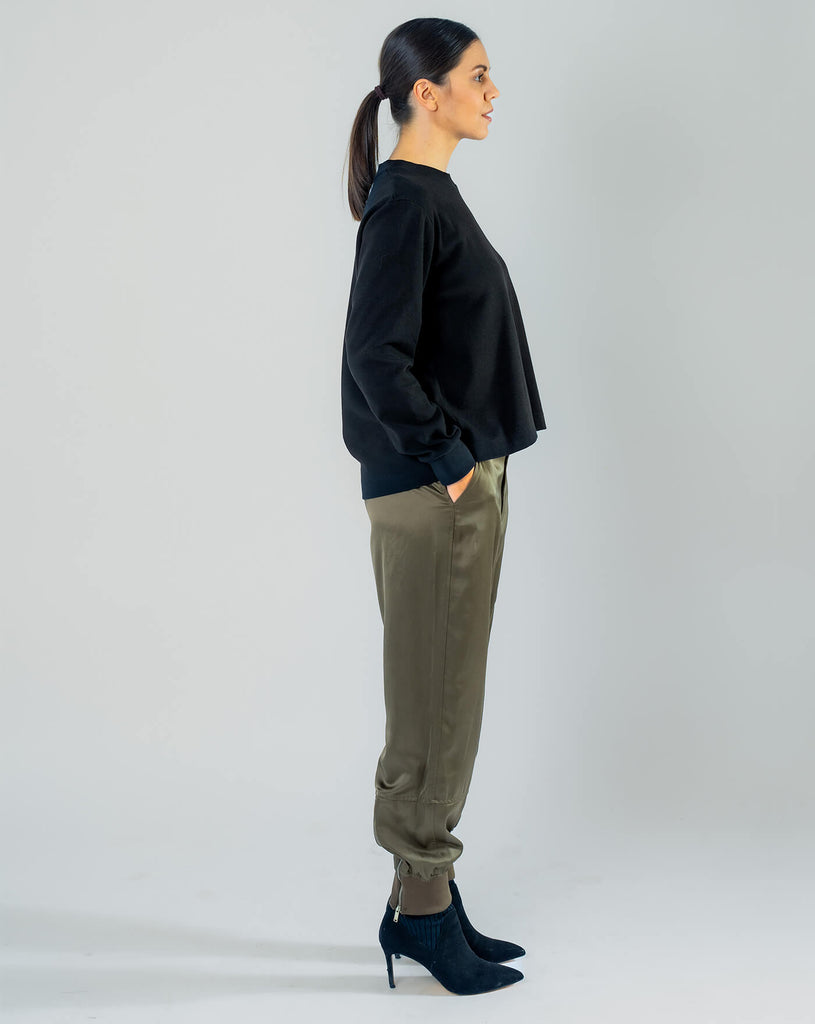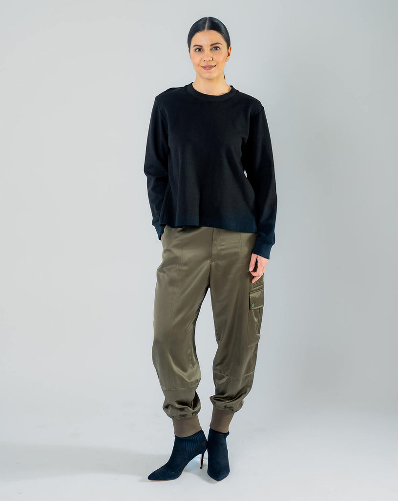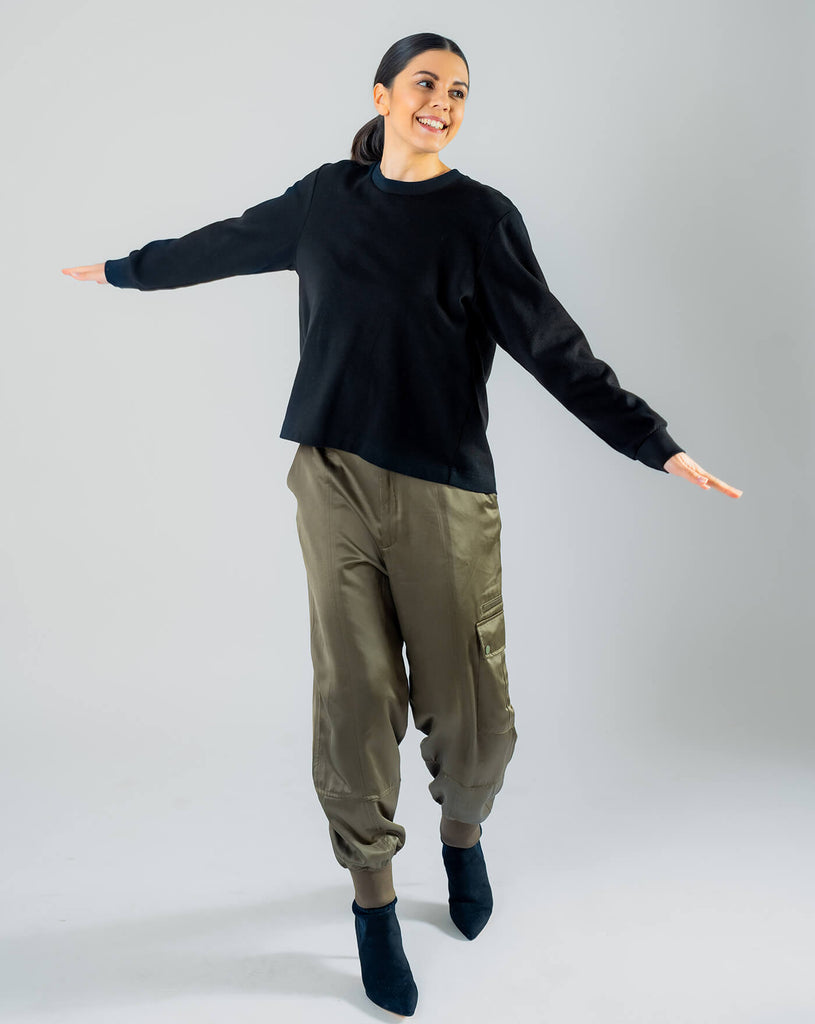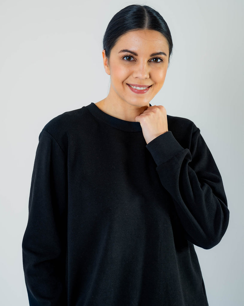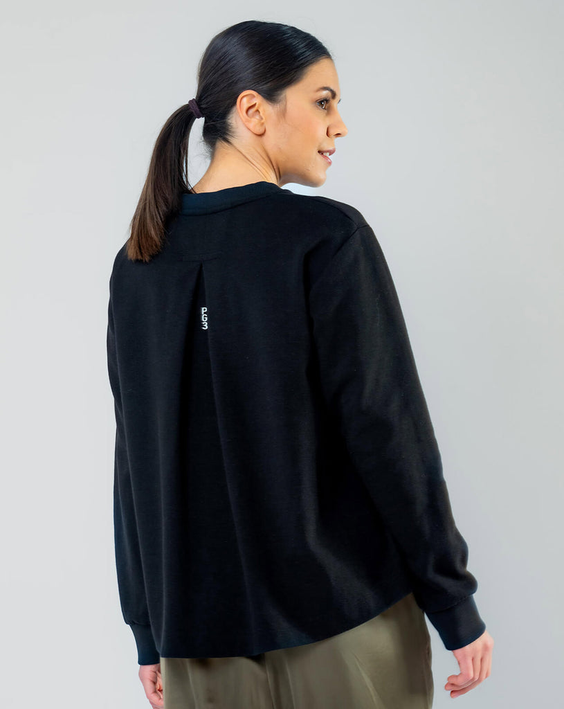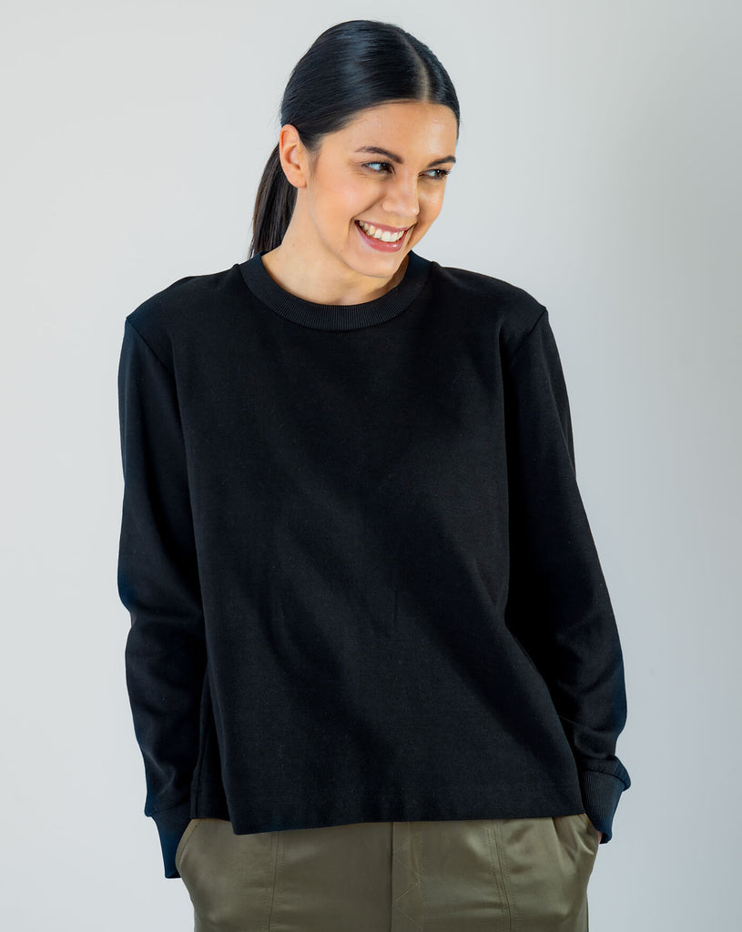 PG3Durch die Kellerfalte am Rücken und dem Vokuhila Schnitt bietet er viel Bewegungsfreiheit, so lässt er sich wunderbar für jeden Tag und jeden Anlass kombinieren. Auf den ersten Blick minimalistisch, auf den zweiten Blick ein Round Neck Sweater in schwarz mit WOW-Effekt.