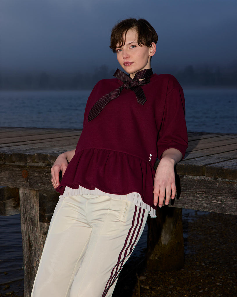 Der Volant Sweater PENELOPE für Damen vereint puristisches Design mit femininer Eleganz und ist eine absolute Neuheit für moderne Layering-Looks. Das fein gearbeitete Volant („Schösschen“) am Saum verleiht dem klaren Schnitt eine stilvolle Note und sorgt für eine schmeichelhafte Silhouette.